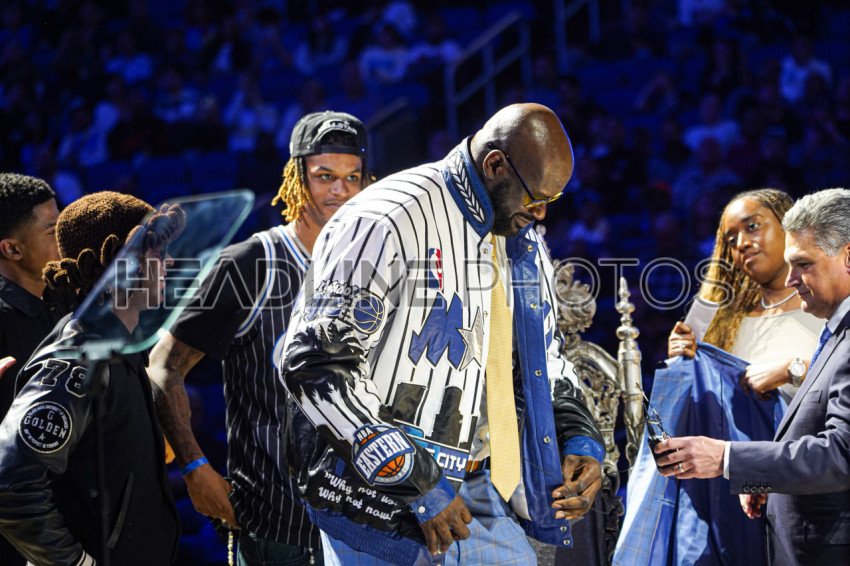 Orlando, Florida, USA, February 13, 2024, Shaquille O'Neal putting on a specialized Orlando Magic Jacket presented by his kids for his Jersey Retirement Ceremony at the Kia Center. (Photo Credit: Marty Jean-Louis)