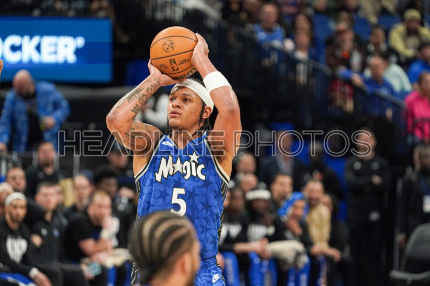 Orlando, Florida, USA, February 14, 2024, Orlando Magic forward Paolo Banchero #5 shoots a three at the Kia Center. (Photo Credit: Marty Jean-Louis)