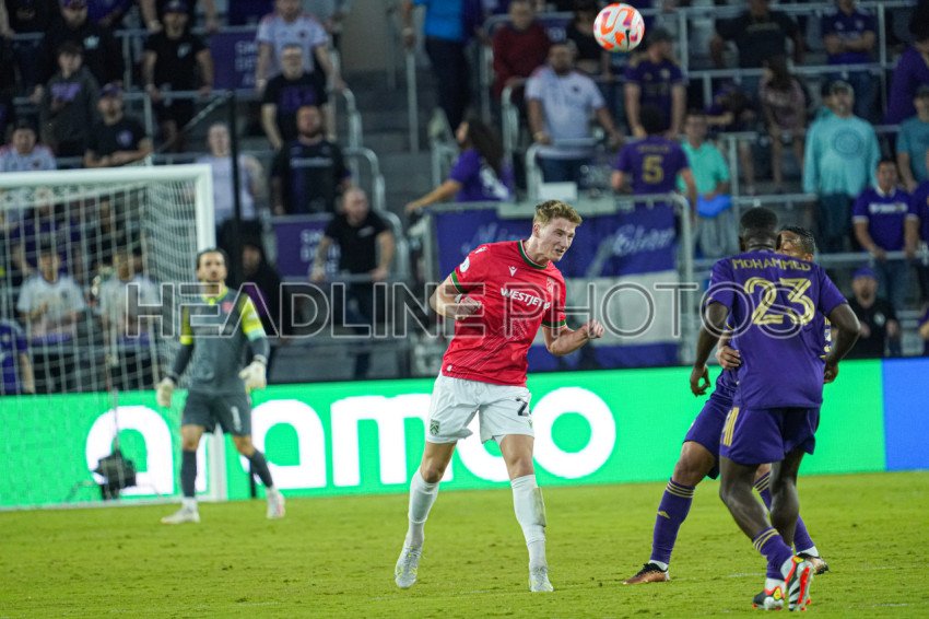 Orlando, Florida, USA, Calvary FC, Calvary FC defender Eryk Kobza #24 makes a header during the match at Inter&Co Stadium in the CONCACAF Champions Cup Match. (Photo Credit: Marty Jean-Louis)