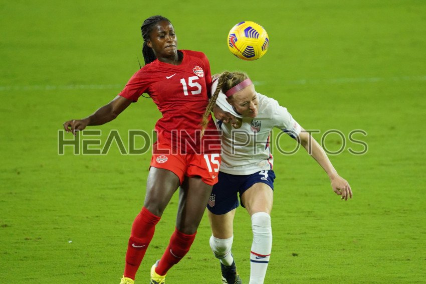 Orlando, Florida, USA, February 18, 2021, USA defender Becky Sauerbrunn #4 and Canada's forward Nichelle Prince #15 fight for the ball during the SheBelieves Cup at Exploria Stadium (Photo Credit: Marty Jean-Louis)
