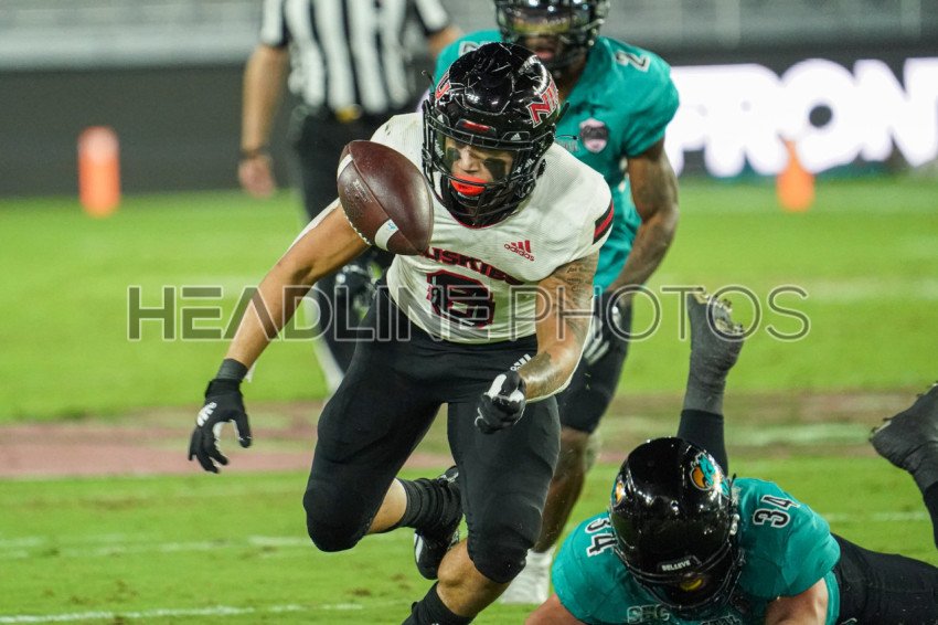 Orlando, Florida, USA, December 15, 2021, NIU Huskies Nose Tackle Jeffrey Griffin JR #8 loses control of the ball during the 7th Annual Tailgreeter Cure Bowl at Exploria Stadium (Photo Credit: Marty Jean-Louis)