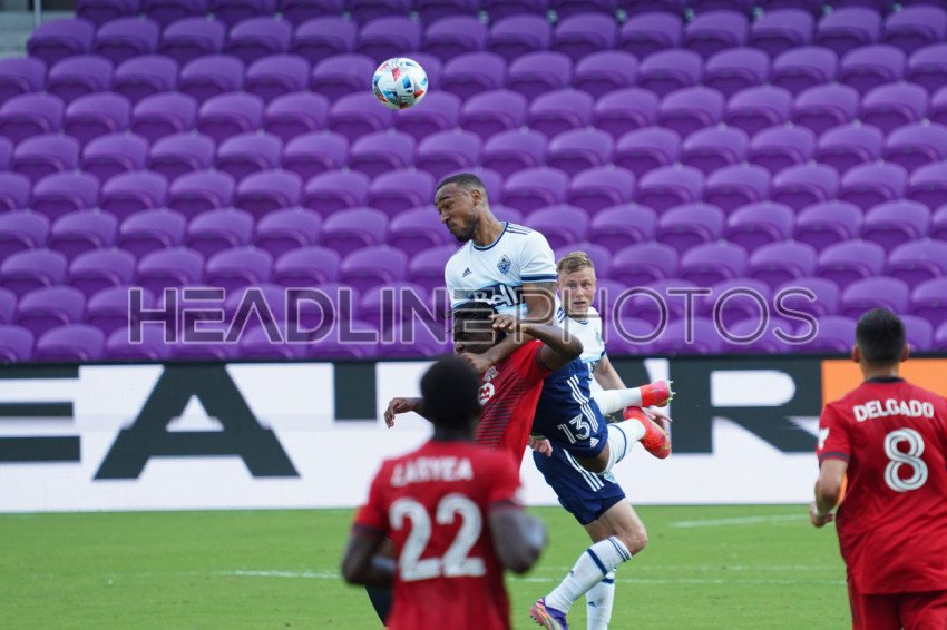 Orlando, Florida, USA, April 24, 2021, Vancouver Whitecaps FC Defender Derek Cornelius #13 makes a header during the match at Exploria Stadium in Orlando Florida, USA (Photo Credit: Marty Jean-Louis)