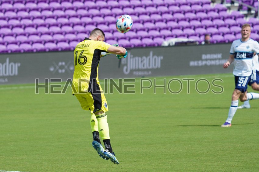 Orlando, Florida, USA, April 24, 2021, Vancouver Whitecaps FC Goalkeeper Maxime Crйpeau #16 makes a header during the match at Exploria Stadium in Orlando Florida, USA (Photo Credit: Marty Jean-Louis)