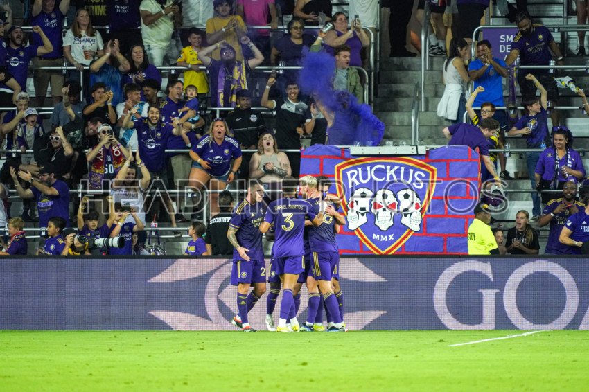 Orlando, Florida, USA, March 23, 2024, Orlando City SC players celebrate goal in front of the Rockus crowd at Inter&Co Stadium. (Photo Credit: Marty Jean-Louis)