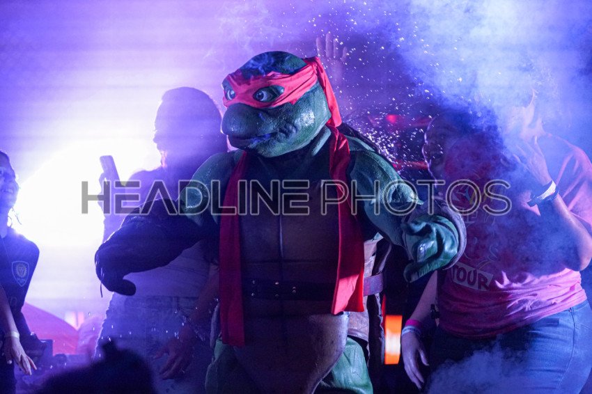 Orlando, Florida, USA, March 23, 2024, Ninja Turtle Michael Angelo dancing while Rapper Vanilla Ice (Robert Matthew Van Winkle) performs during a 90s concert hosted by Orlando City SC at Inter&Co Stadium. (Photo Credit: Marty Jean-Louis)