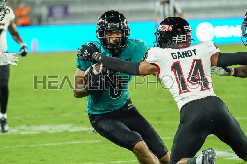 Orlando, Florida, USA, December 15, 2021, Coastal Carolina Chanticleers Wide Receiver Jaivon Heiligh #6 face NIU Huskies Cornerback Jordan Gandy #14 during the 7th Annual Tailgreeter Cure Bowl at Exploria Stadium (Photo Credit: Marty Jean-Louis)