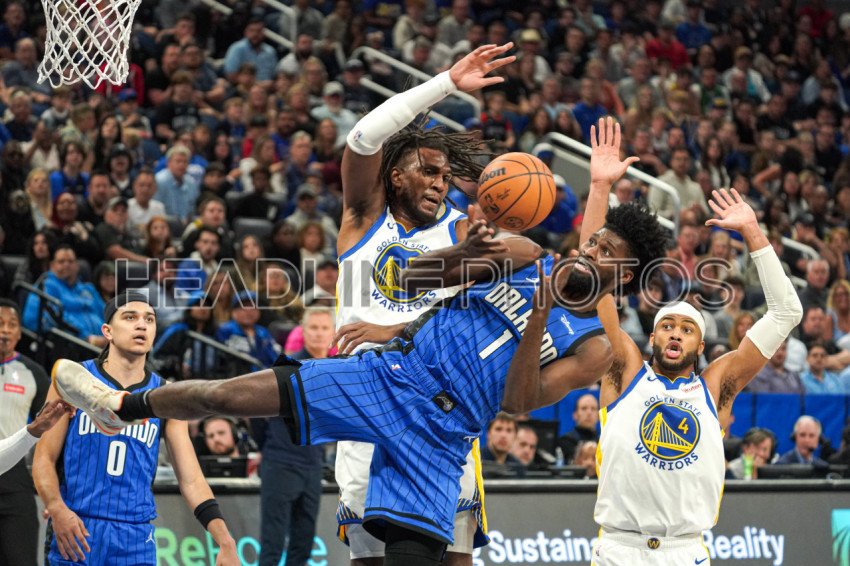 Orlando, Florida, USA, March 27, 2024, Orlando Magic forward Jonathan Isaac #1 is fouled by Kevon Looney #5 at the Kia Center. (Photo Credit: Marty Jean-Louis)