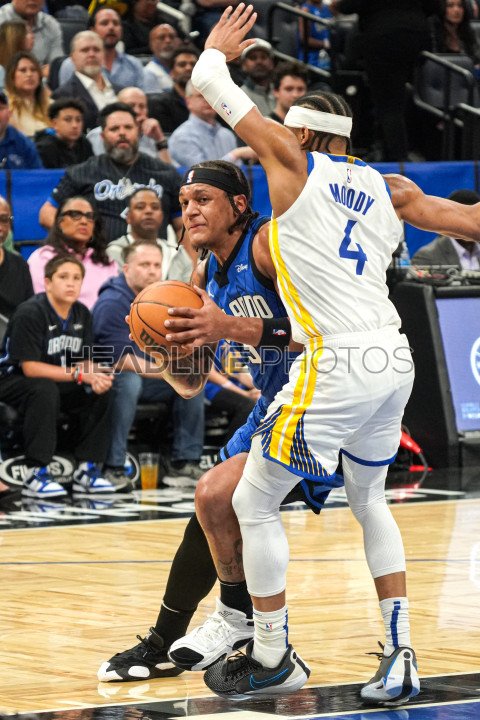 Orlando, Florida, USA, March 27, 2024, Orlando Magic's Paolo Banchero #5 attmpt to run pass Moses Moody #4 at the Kia Center. (Photo Credit: Marty Jean-Louis)