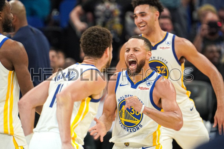 Orlando, Florida, USA, March 27, 2024, Golden State Warriors guard Stephen Curry #30, Klay Thompson #11 and Trayce Jackson-Davis celebrate win against the Orlando Magic at the Kia Center. (Photo Credit: Marty Jean-Louis)