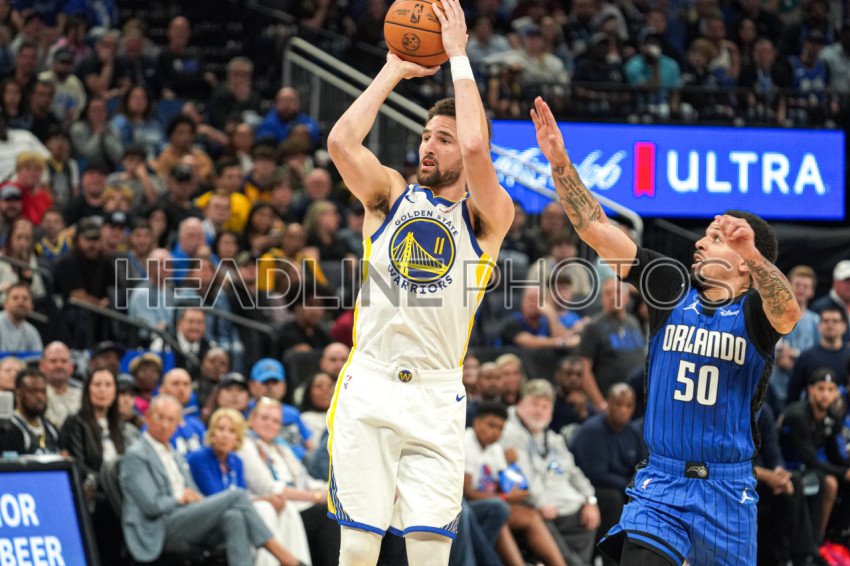 Orlando, Florida, USA, March 27, 2024, Golden State Warriors guard Klay Thompson #11 shoots a three at the Kia Center. (Photo Credit: Marty Jean-Louis)