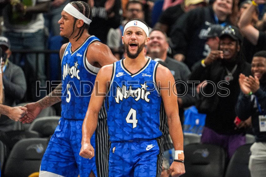Orlando, Florida, USA, March 29, 2024, Orlando Magic players Jalen Suggs #4 and Paolo Banchero #5 celebrate after making a steal and a shot at the Kia Center. (Photo Credit: Marty Jean-Louis)
