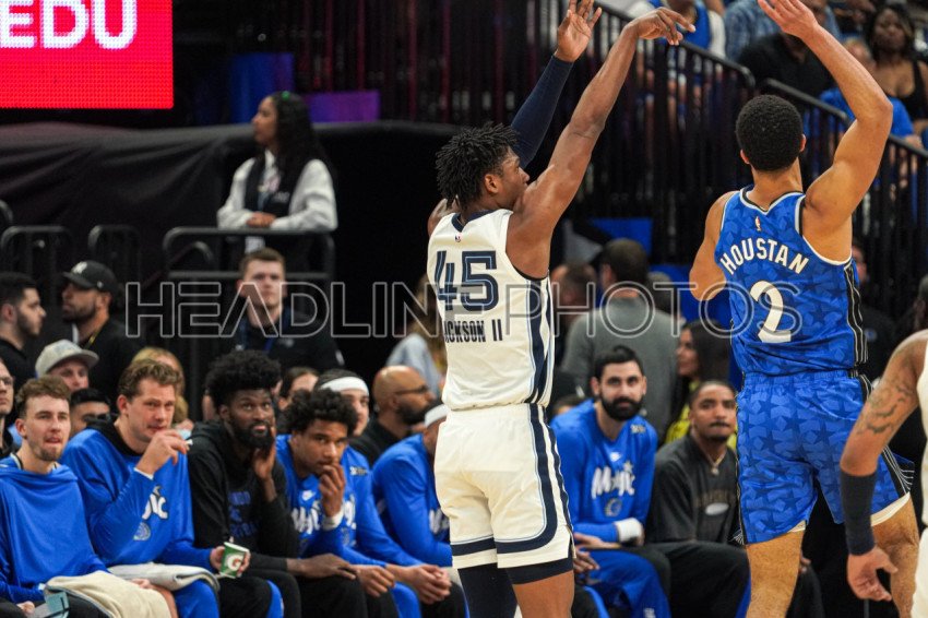 Orlando, Florida, USA, March 30, 2024, Memphis Grizzlies player GG Jackson #45 shoots a three at the Kia Center. (Photo Credit: Marty Jean-Louis)