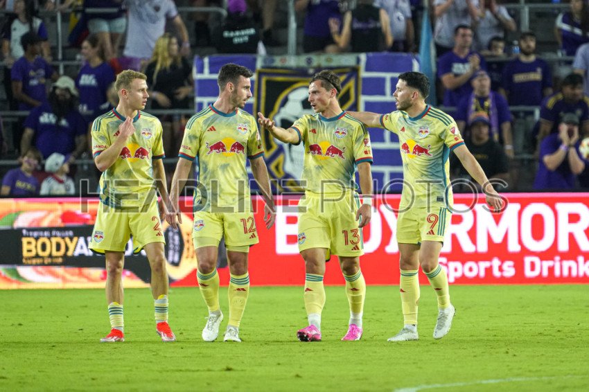 Orlando, Florida, USA, March 30, 2024, New York Red Bulls players Dennis Gjengaar #2, Dylan Nealis #12, Dante Vanzeir #13 and Lewis Morgan #9 at Inter&Co Stadium. (Photo Credit: Marty Jean-Louis)