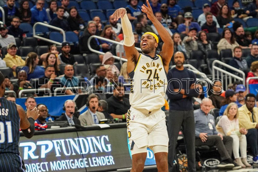 Orlando, Florida, USA, February 28, 2022, Indiana Pacers shooting guard Buddy Hield #24 shoots a three point shot at the Amway Center. (Photo Credit: Marty Jean-Louis)