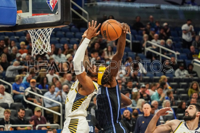 Orlando, Florida, USA, February 28, 2022, Indiana Pacers Small Forward Oshae Brissett #12 attempt to make a shot but is blocked Orlando's Mo Bamba #5 at the Amway Center. (Photo Credit: Marty Jean-Louis)