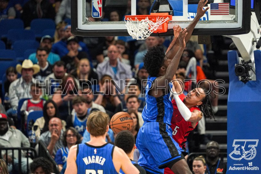 Orlando, Florida, USA, April 1, 2024, Portland Trail Blazers guard Dalano Banton #5 makes a dunk as Jonathan Isaac tries to block at the Kia Center. (Photo Credit: Marty Jean-Louis)