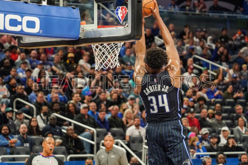 Orlando, Florida, USA, March 13, 2022, Orlando Magic Center Wendell Carter Jr #34 makes a dunk against the Philadelphia 76ers during the second half at the Amway Center. (Photo Credit: Marty Jean-Louis)