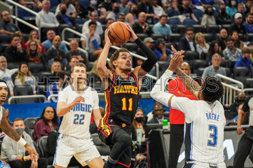 Orlando, Florida, USA, February 16, 2022, Atlanta Hawks Point Guard Trae Young #11 looks to make a pass during the first quarter at the Amway Center. (Photo Credit: Marty Jean-Louis)