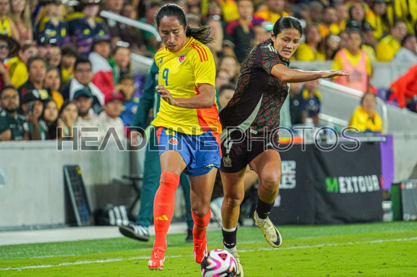 Orlando, Florida, April 6, 2024, Colombia forward Mayra Ramirez #9 and Rebeca Bernal #4 fight for the ball in a Friendly Match at Inter&Co Stadium. (Photo Credit: Marty Jean-Louis)