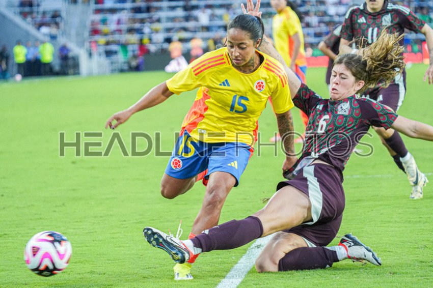 Orlando, Florida, April 6, 2024, Colombia player Manuela Pavi #15 runs after a pass as Nicollete Hernandez #6 kicks the ball out in a Friendly Match at Inter&Co Stadium. (Photo Credit: Marty Jean-Louis)