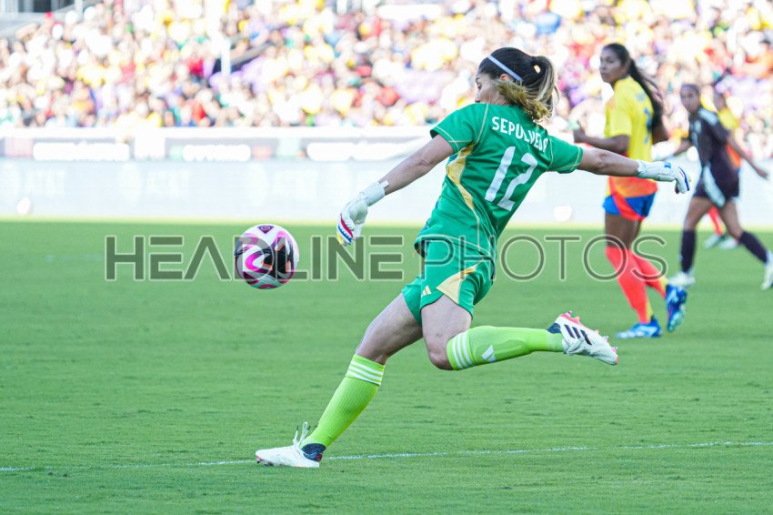 Orlando, Florida, April 6, 2024, Colombia goalkeeper Sandra Sepulveda #12 makes a kick in a Friendly Match at Inter&Co Stadium. (Photo Credit: Marty Jean-Louis)