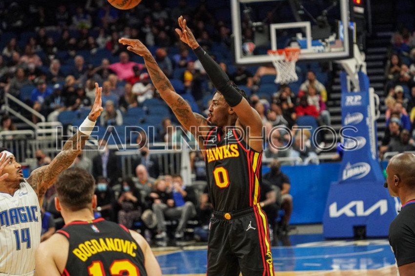 Orlando, Florida, USA, February 16, 2022, Atlanta Hawks Shooting Guard Delon Wright #0 shoots a three point at the Amway Center. (Photo Credit: Marty Jean-Louis)