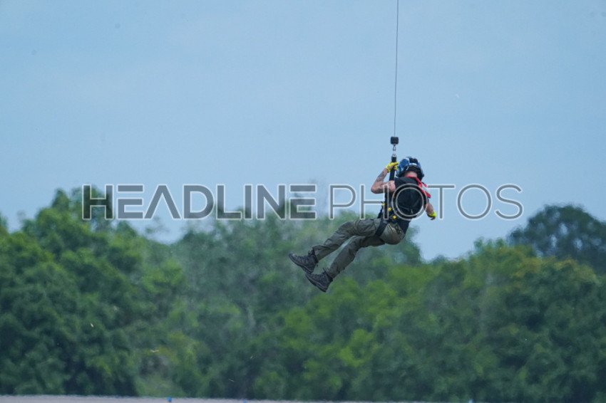 Sanford, Florida, USA, April 21, 2024, US Coast Guard Rescue swimmer demonstrating a save During the 2024 Orlando Air Show at the Orlando, Sanford International Airport. (Photo Credit: Marty Jean-Louis)