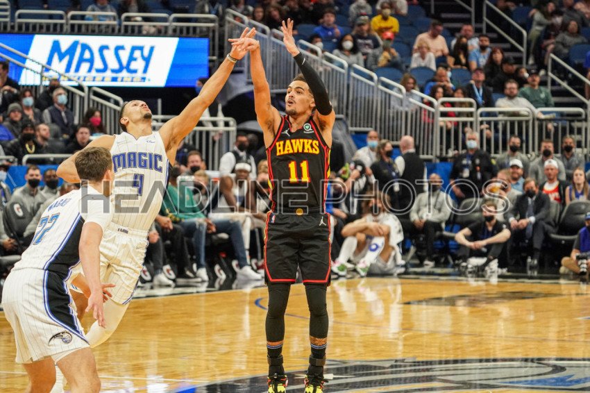 Orlando, Florida, USA, February 16, 2022, Atlanta Hawks player Trae Young #11 shoots a three point at the Amway Center. (Photo Credit: Marty Jean-Louis)