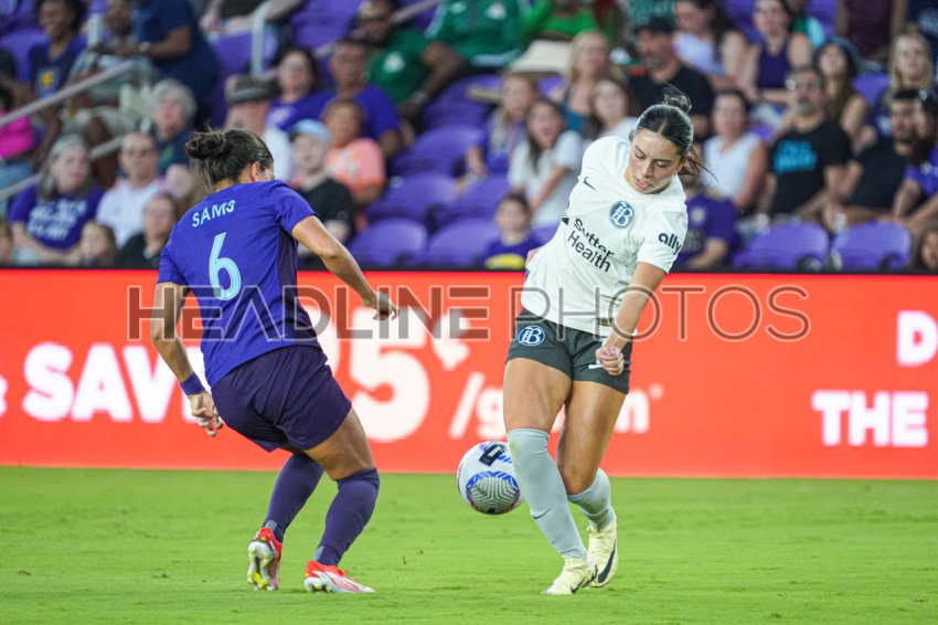 Orlando, Florida, USA, May 11, 2024, Orlando Pride Emily Sams #6 makes a steal from Scarlett Camberos #11 at Inter&Co Stadium. (Photo Credit: Marty Jean-Louis)