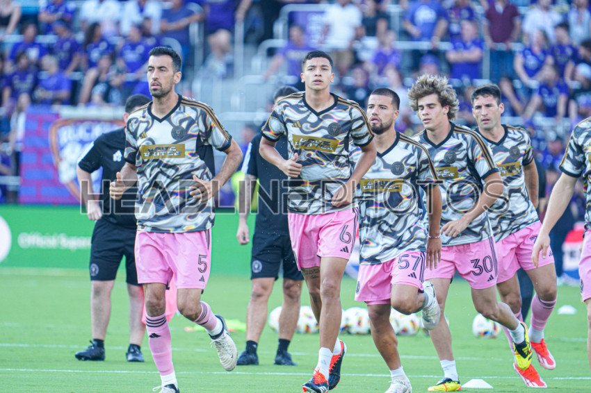Orlando, Florida, USA, May 15, 2024, Inter Miami players Sergio busquets #5, Tomas Aviles #6, Marcelo Weigandt #57 warms up at Inter&Co Stadium. (Photo Credit: Marty Jean-Louis)