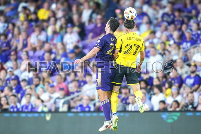 Orlando, Florida, USA, May 25, 2024, Columbus Crew midfielder Max Arfsten #27 wins the header at Inter&Co Stadium. (Photo Credit: Marty Jean-Louis)
