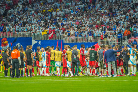 Atlanta, Georgia, USA, June 20, 2024, Canada and Argentina players at the end of the match during the 2024 Copa America at Mercedes-Benz Stadium. (Photo Credit: Marty Jean-Louis)
