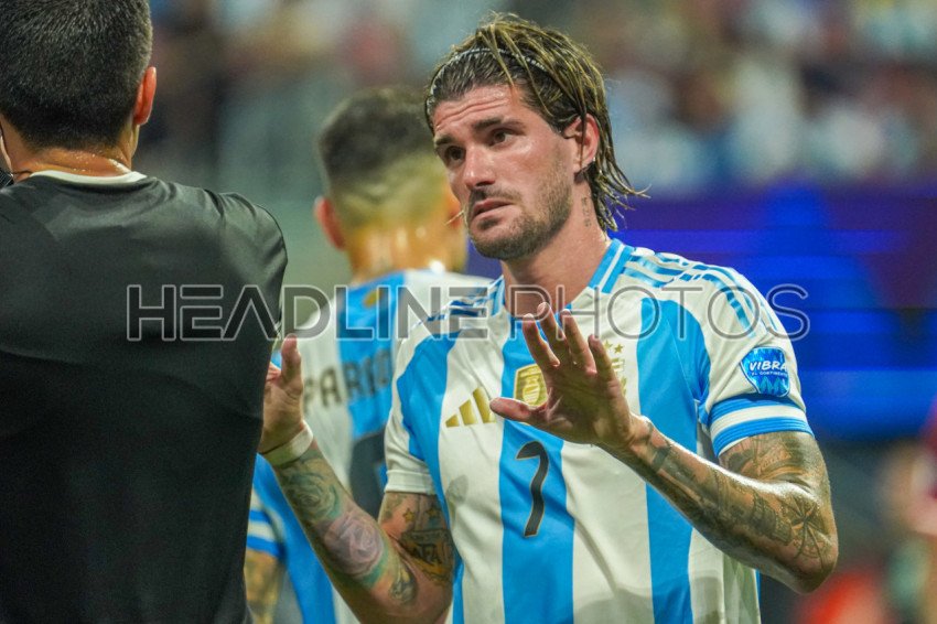 Atlanta, Georgia, USA, June 20, 2024, Argentina midfielder Rodrigo De Paul #7 speak with the Ref during the 2024 Copa America at Mercedes-Benz Stadium. (Photo Credit: Marty Jean-Louis)