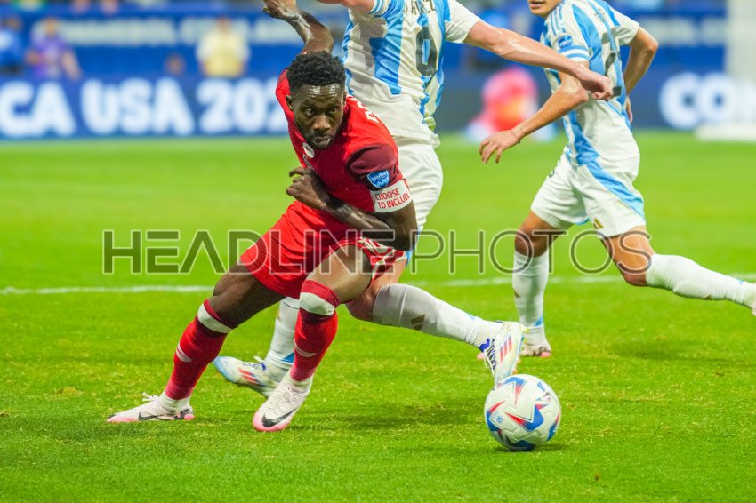 Atlanta, Georgia, USA, June 20, 2024, Canada captain Alphonso Davies #19 defends the ball during the 2024 Copa America at Mercedes-Benz Stadium. (Photo Credit: Marty Jean-Louis)