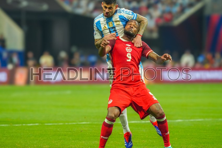 Atlanta, Georgia, USA, June 20, 2024, players Cyle Larin #9 and Cristian Romero#13 fight for the ball during the 2024 Copa America at Mercedes-Benz Stadium. (Photo Credit: Marty Jean-Louis)