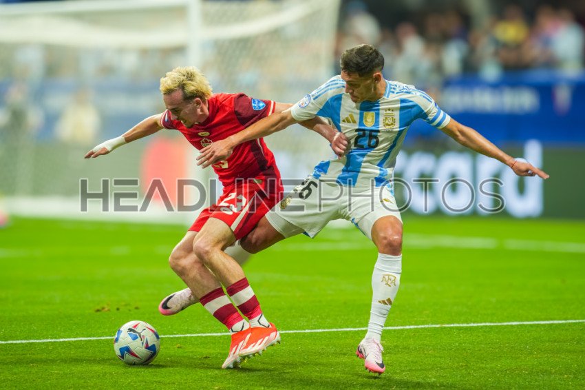 Atlanta, Georgia, USA, June 20, 2024, Argentina defender Nahuel Molina #26 attempt to steal the ball from Liam Millar #23 during the 2024 Copa America at Mercedes-Benz Stadium. (Photo Credit: Marty Jean-Louis)