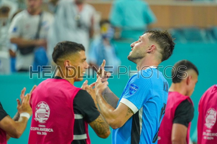 Miami Gardens, Florida, USA, June 20, 2024, Uruguay defender Matías Viña #17 reacts after scoring during the 2024 Copa America at the Hard Rock Stadium. (Photo Credit: Marty Jean-Louis)