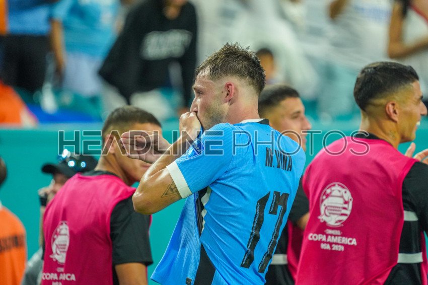 Miami Gardens, Florida, USA, June 20, 2024, Uruguay defender Matías Viña #17 reacts after scoring during the 2024 Copa America at the Hard Rock Stadium. (Photo Credit: Marty Jean-Louis)