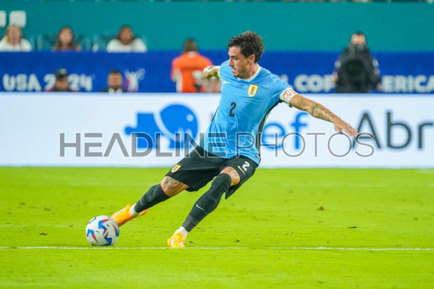 Miami Gardens, Florida, USA, June 20, 2024, Uruguay player José María Giménez #2 makes a pass during the 2024 Copa America at the Hard Rock Stadium. (Photo Credit: Marty Jean-Louis)