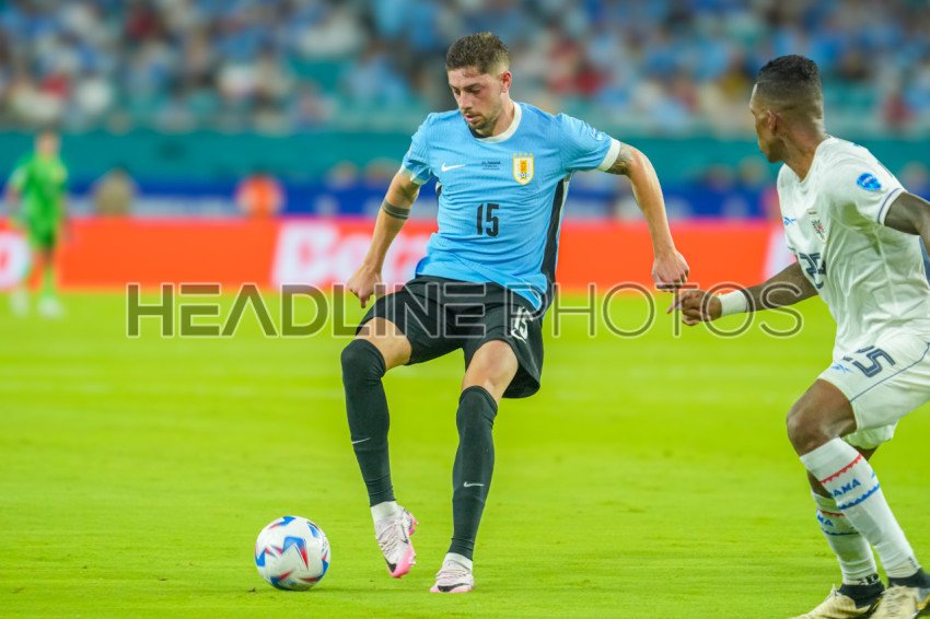 Miami Gardens, Florida, USA, June 20, 2024, Uruguay player Federico Valverde #15 makes a pass during the 2024 Copa America at the Hard Rock Stadium. (Photo Credit: Marty Jean-Louis)