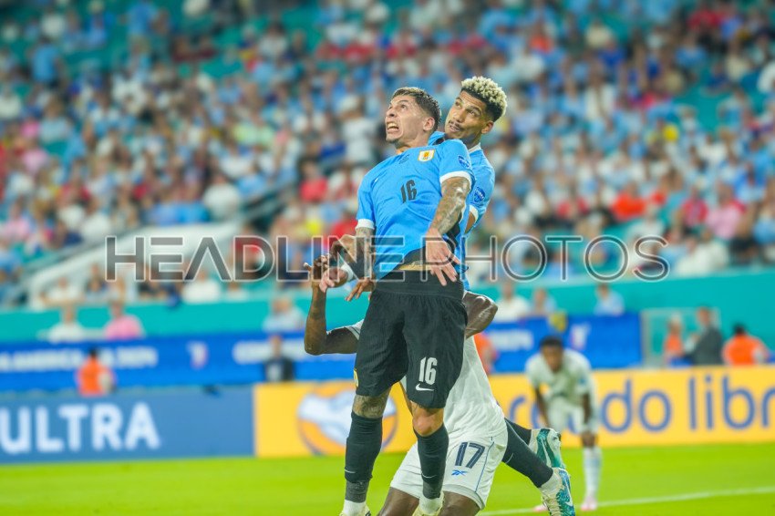 Miami Gardens, Florida, USA, June 20, 2024, Uruguay defender Mathías Olivera #16 jump to make a header during the 2024 Copa America at the Hard Rock Stadium. (Photo Credit: Marty Jean-Louis)