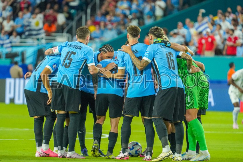 Miami Gardens, Florida, USA, June 20, 2024, Uruguay players huddle during the 2024 Copa America at the Hard Rock Stadium. (Photo Credit: Marty Jean-Louis)