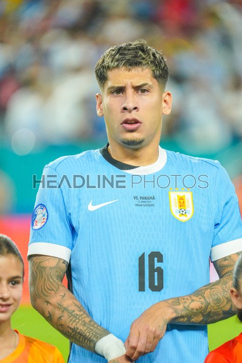 Miami Gardens, Florida, USA, June 20, 2024, Uruguay defender Mathías Olivera #16 during the 2024 Copa America at the Hard Rock Stadium. (Photo Credit: Marty Jean-Louis)
