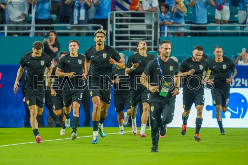Miami Gardens, Florida, USA, June 20, 2024, Uruguay players enter the field for warm up during the 2024 Copa America at the Hard Rock Stadium. (Photo Credit: Marty Jean-Louis)