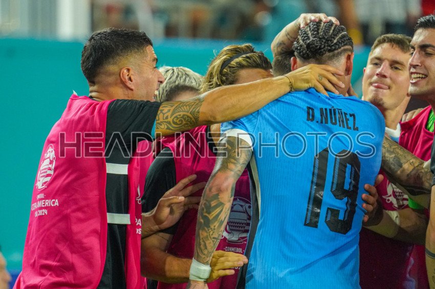 Miami Gardens, Florida, USA, June 20, 2024, Uruguay forward Darwin Núñez #19 share a moment with Luis Suarez #9 after scoring during the 2024 Copa America at the Hard Rock Stadium. (Photo Credit: Marty Jean-Louis)