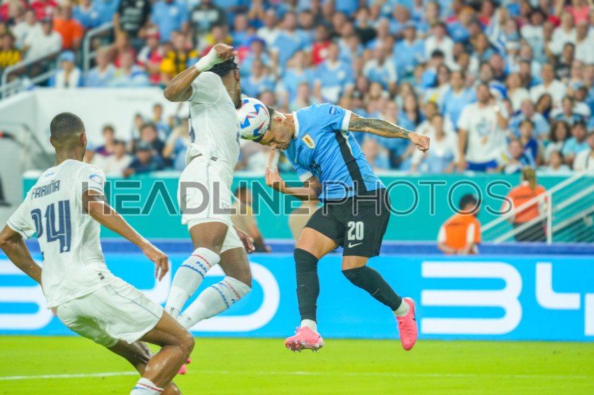 Miami Gardens, Florida, USA, June 20, 2024, Uruguay player Maximiliano Araújo #20 makes a header during the 2024 Copa America at the Hard Rock Stadium. (Photo Credit: Marty Jean-Louis)