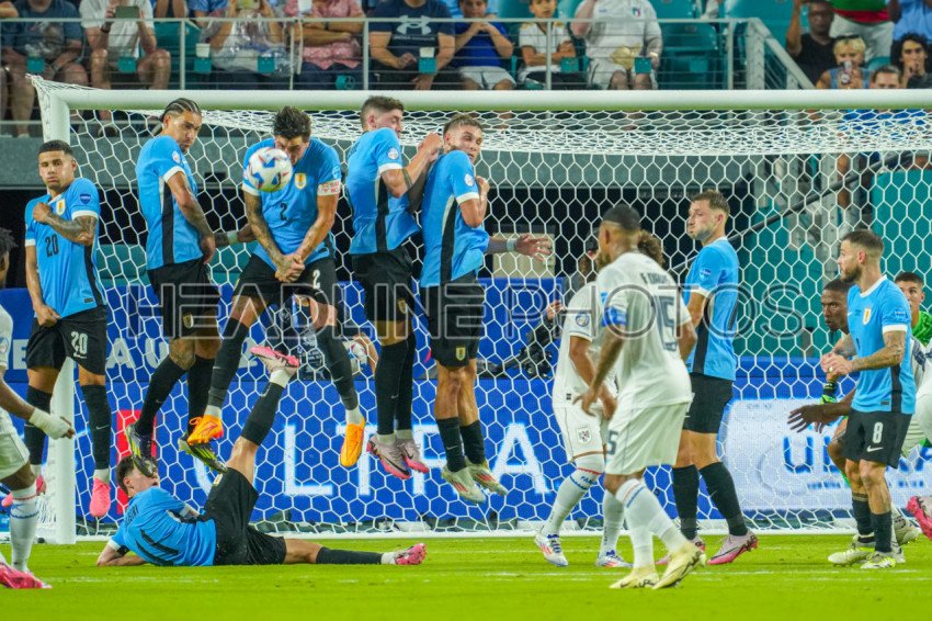 Miami Gardens, Florida, USA, June 20, 2024, Uruguay players attempt to block the free kick during the 2024 Copa America at the Hard Rock Stadium. (Photo Credit: Marty Jean-Louis)