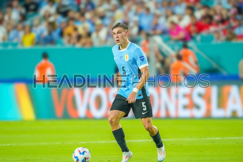 Miami Gardens, Florida, USA, June 20, 2024, Uruguay midfielder Manuel Ugarte #5 look to make a pass during the 2024 Copa America at the Hard Rock Stadium. (Photo Credit: Marty Jean-Louis)