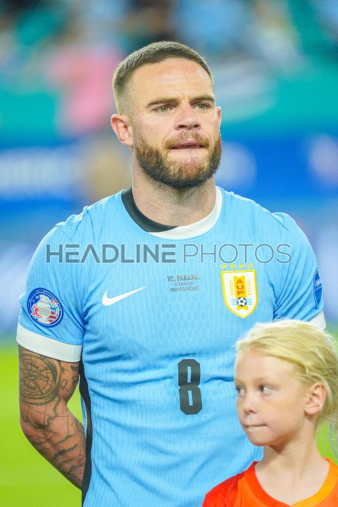 Miami Gardens, Florida, USA, June 20, 2024, Uruguay player Nahitan Nández #8 during the 2024 Copa America at the Hard Rock Stadium. (Photo Credit: Marty Jean-Louis)