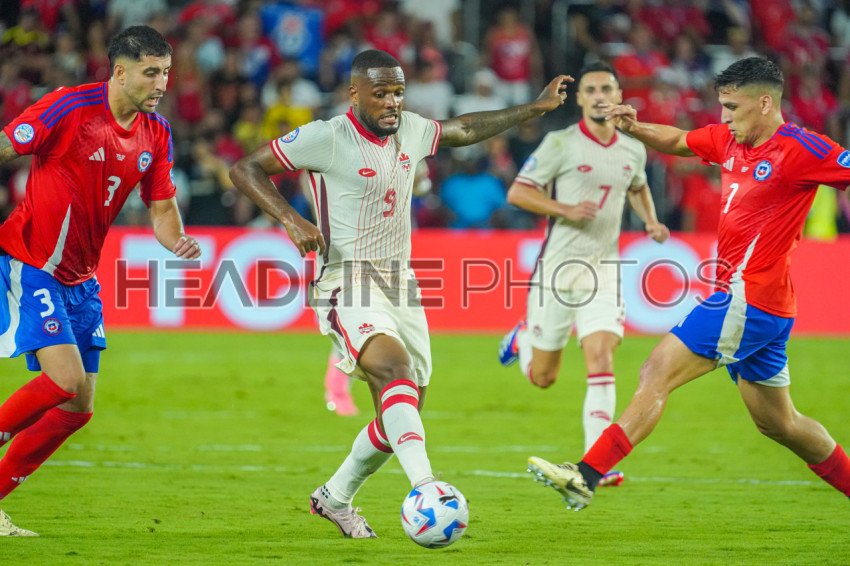 Orlando, Florida, USA, June 20, 2024, Canada forward Cyle Larin #9 runs up field as he receives pressure from Guillermo Maripán #3 and Marcelino Núñez #7 during the 2024 Copa America at Inter&Co Stadium. (Photo Credit: Marty Jean-Louis)
